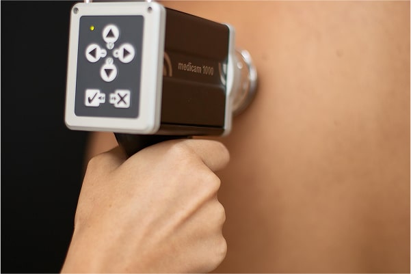 O FotoFinder é um equipamento de alta tecnologia que realiza mapeamento corporal digital para diagnóstico precoce do câncer de pele, permitindo um acompanhamento detalhado.